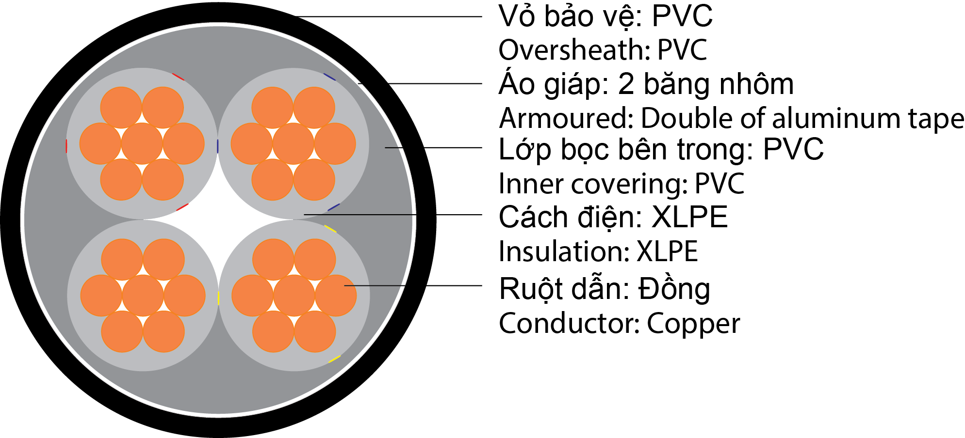 CÁP ĐIỆN LỰC, RUỘT ĐỒNG, CÁCH ĐIỆN XLPE, GIÁP 02 BĂNG NHÔM, VỎ PVC.