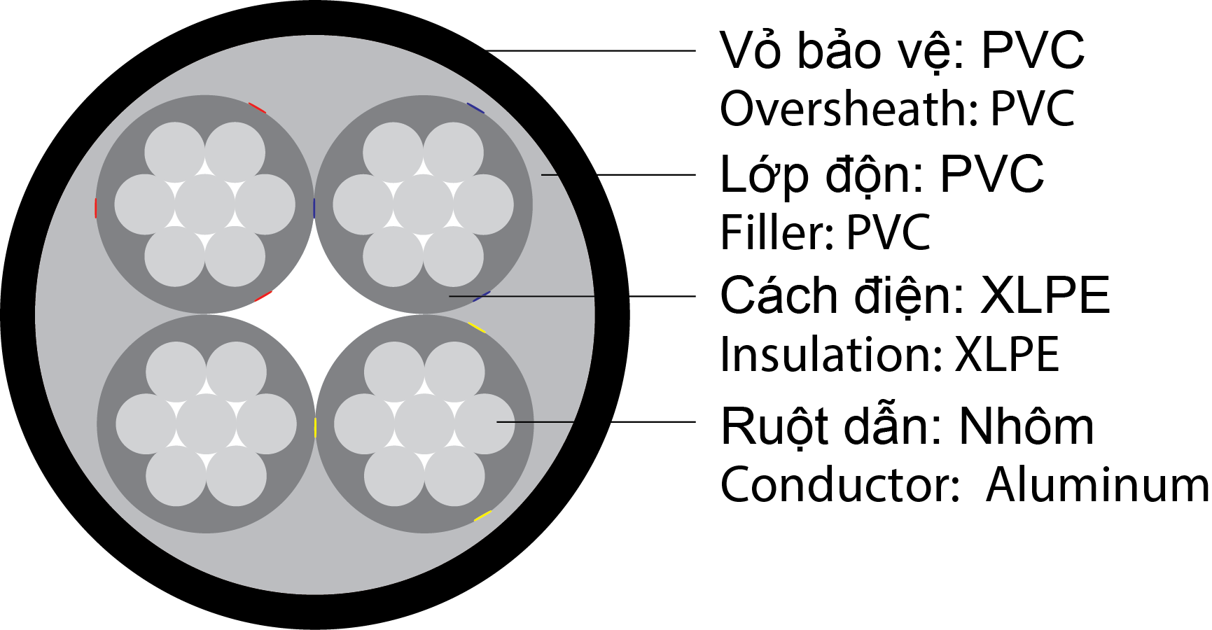Kí hiệu: A/XLPE/PVC – 0,6/1KV Loại 1,2,3,4 Lõi.