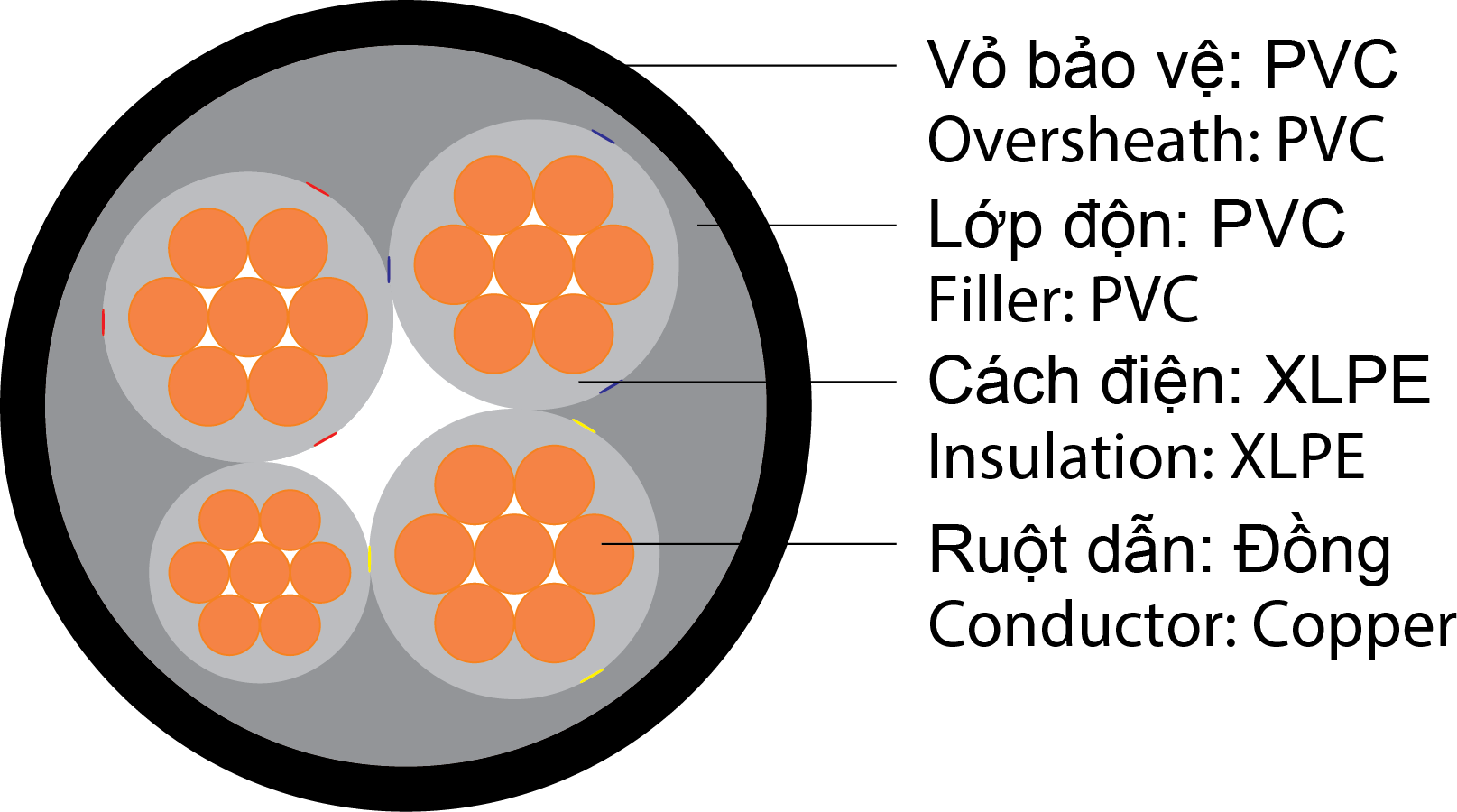 CÁP ĐIỆN LỰC, C/XLPE/PVC – 0,6/1KV Loại 3 Lõi + Trung Tính, RUỘT ĐỒNG, CÁCH ĐIỆN XLPE, VỎ PVC.