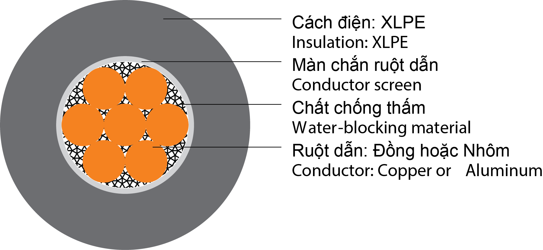 CÁP TRUNG THẾ CX – AX – 12.7/22(24)KV, RUỘT ĐỒNG HOẶC NHÔM, CHỐNG THẤM RUỘT DẪN, CÁCH ĐIỆN XLPE.
