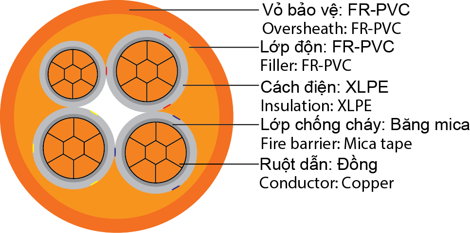 Cáp chống cháy, 3 pha + 1 trung tính, ruột đồng, cách điện XLPE – 0.6/1KV, võ bọc FR-PVC