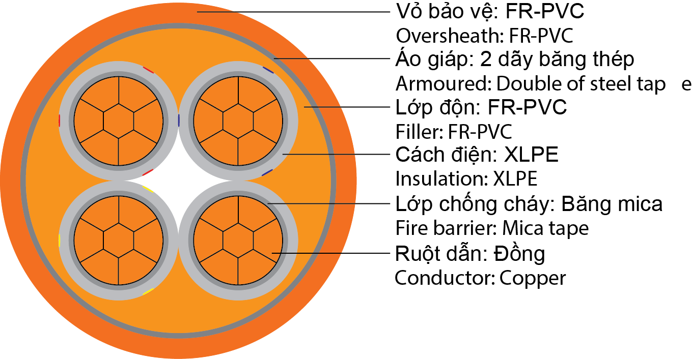 Cáp chống cháy, FR- C/XLPE/PVC/DSTA/PVC , 3 pha 1 trung tính, ruột đồng, cách điện XLPE – 0.6/1KV, Giáp 2 băng thép, vỏ bọc FR- PVC.